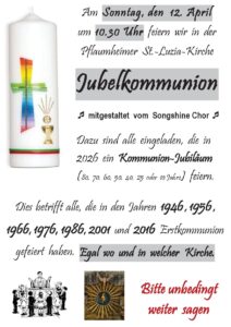 Am „Weißen Sonntag“ (12.4.), also eine Woche nach Ostern, sind zum Gottesdienst um 10.30 Uhr alle sehr herzlich in die Pflaumheimer St.-Luzia-Kirche eingeladen, die in diesem Jahr ihr 80-, 70-, 60-, 50-, 40-, 25- oder 10-jähriges Kommunionjubiläum feiern.