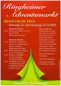 Herzliche Einladung zum Ringheimer Adventsmarkt rund um St. Pius! Das Programm können Sie dem abgebildeten Plakat entnehmen.