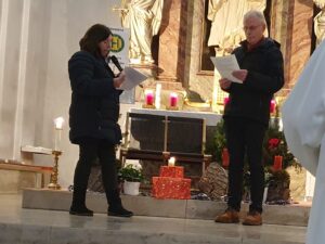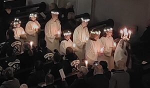 Höhepunkt des Gottesdienstes war am Ende der Lichterumzug mit der „Heiligen Luzia“ (Laura Miklasová), die von den Oberministrantinnen Josefin Jäger und Johanna Klug begrüßt wurde und sich dann selbst mit Grüßen und nachdenklichen Worten an die Gottesdienstbesucher gewendet hat.
