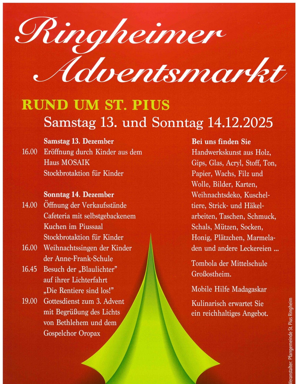 Herzliche Einladung zum Ringheimer Adventsmarkt rund um St. Pius! Das Programm können Sie dem abgebildeten Plakat entnehmen. Am Adventsmarkt beginnt auch der Vorverkauf des Konzertes mit Anselm Grün und Clemens...